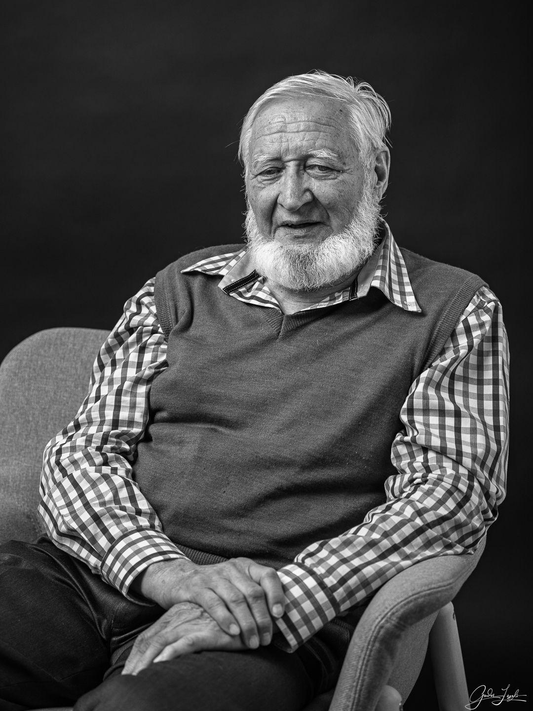 S végül egy utolsó, záró történet, amely már a nyugdíjas éveinkből származik. Asztaltársaságunk, akik havonta egy alkalommal találkozunk, egyik ebédjén vetettem fel Sanyinak, hogy készítenék róla egy portré sorozatot. Ő örömmel, s szívesen állt és ült modellt nekem. Miközben fotóztam nagy röhögcsélések, s story idézések melengették a szívünket.